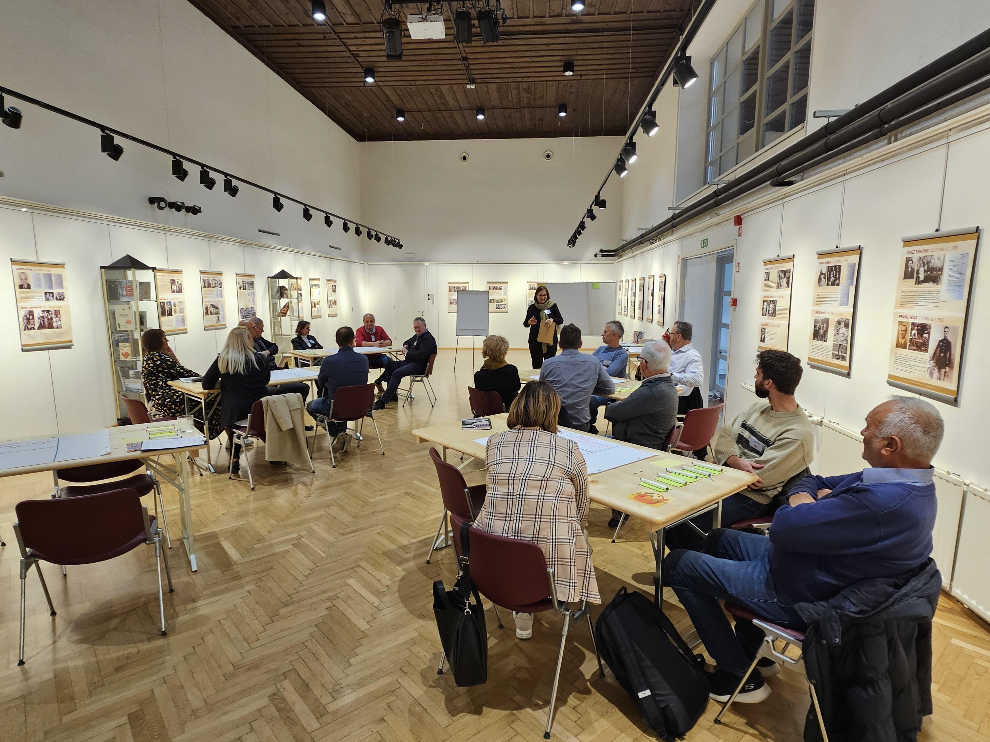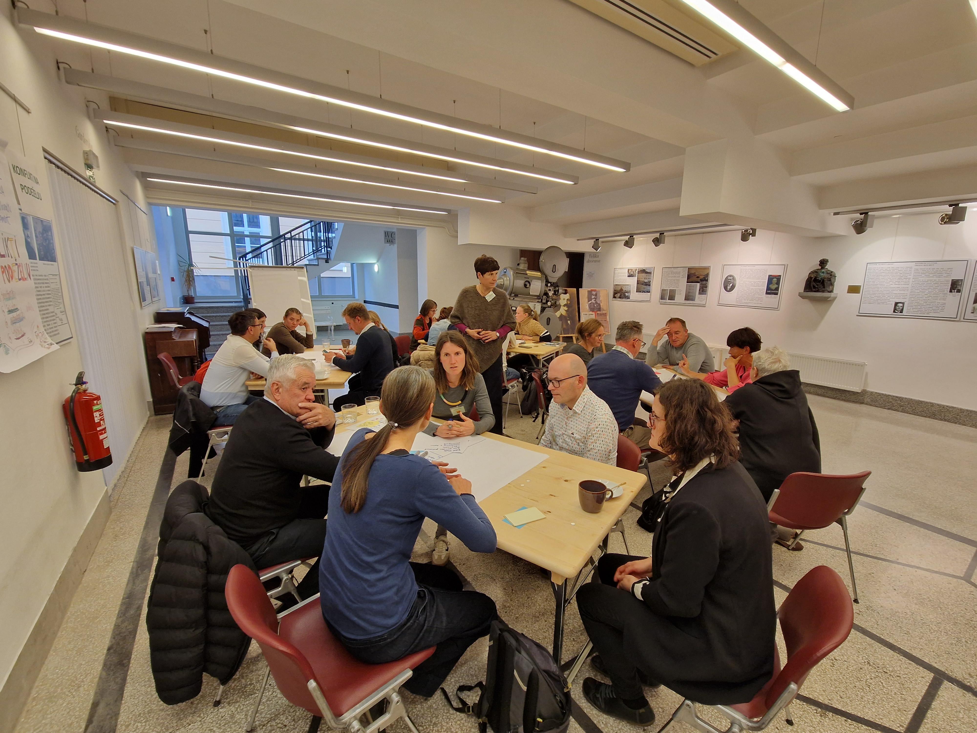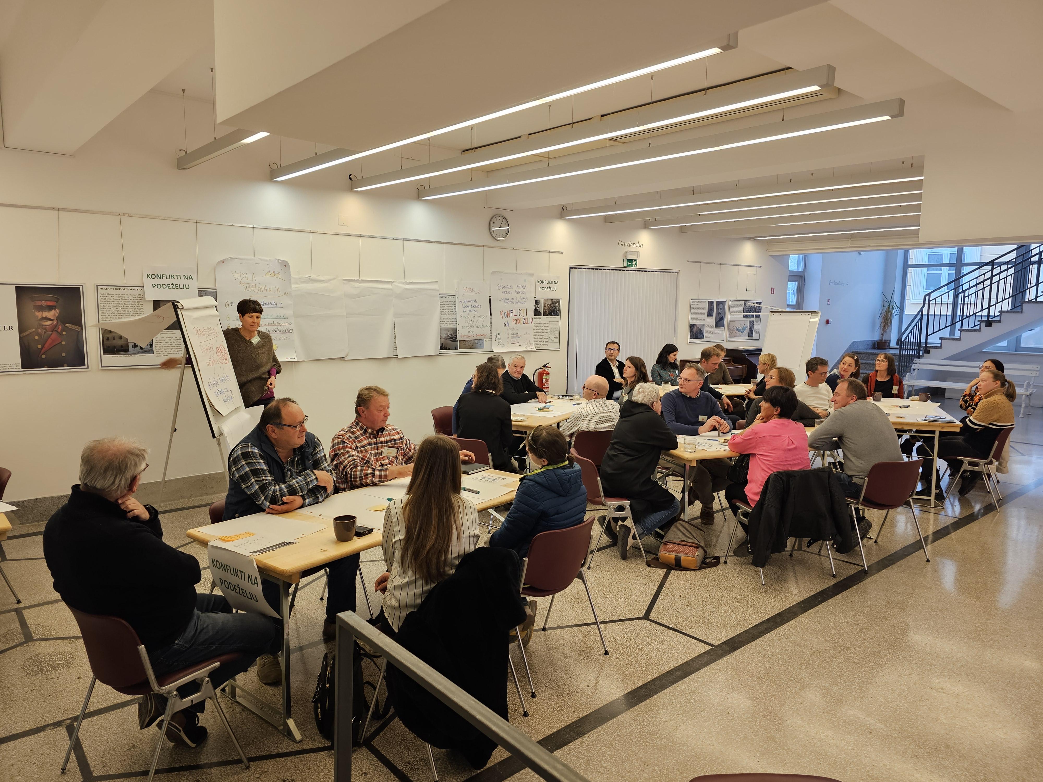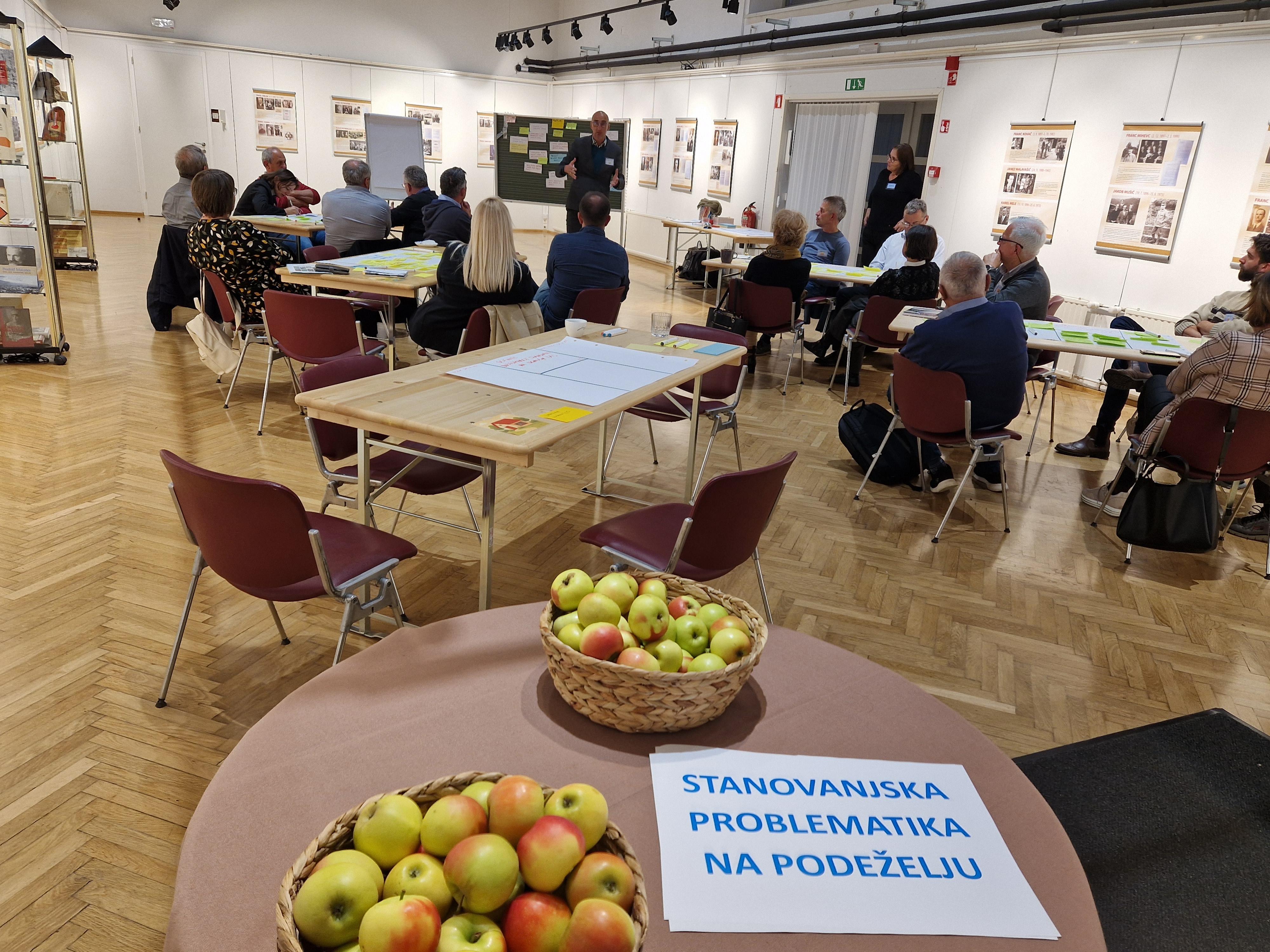 Takoj zatem pa so se udeleženci razdeljeni v dve večji skupini udeležili ene izmed dveh tematskih delavnic. Delavnico »Stanovanjska problematika na podeželju – med pomanjkanjem in neizkoriščenostjo« sta vodila moderatorka Julija Marošek in raziskovalec Boštjan Kerbler, delavnico »Konflikti na podeželju – prostorski, socialni, okoljski in gospodarski vidiki« pa moderatorka Natalija Vrhunc in raziskovalca Andrej Udovč ter Barbara Lampič. Manjše skupine po štiri ali pet sogovorcev so nato razvile pestre razprave, izmenjavo mnenj in pogledov ter rešitev, kako naprej. Z medgeneracijsko in medsektorsko raznolikostjo so bili tako podani raznoliki pogledi na razvoj podeželja. Ob koncu delavnic smo se ponovno sestali vsi skupaj v veliki dvorani in strnili dogodek z dodatnimi vprašanji in odgovori, ki bodo skupaj z izvlečki delavnic prispevali k izdelavi vsebinskega poročila dogodka.